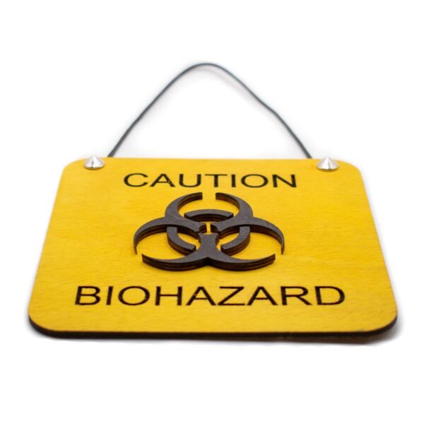 Το μήνυμα ασφαλείας είναι χαραγμένο με ακρίβεια απευθείας στην επιφάνεια του ξύλου, εξασφαλίζοντας την ανεξίτηλη ευκρίνεια των γραμμάτων. Το σύμβολο Biohazard είναι ανάγλυφο και επικολλημένο ως ξεχωριστό τρισδιάστατο στοιχείο, προσδίδοντας οπτικό βάθος και άμεση αναγνωρισιμότητα.